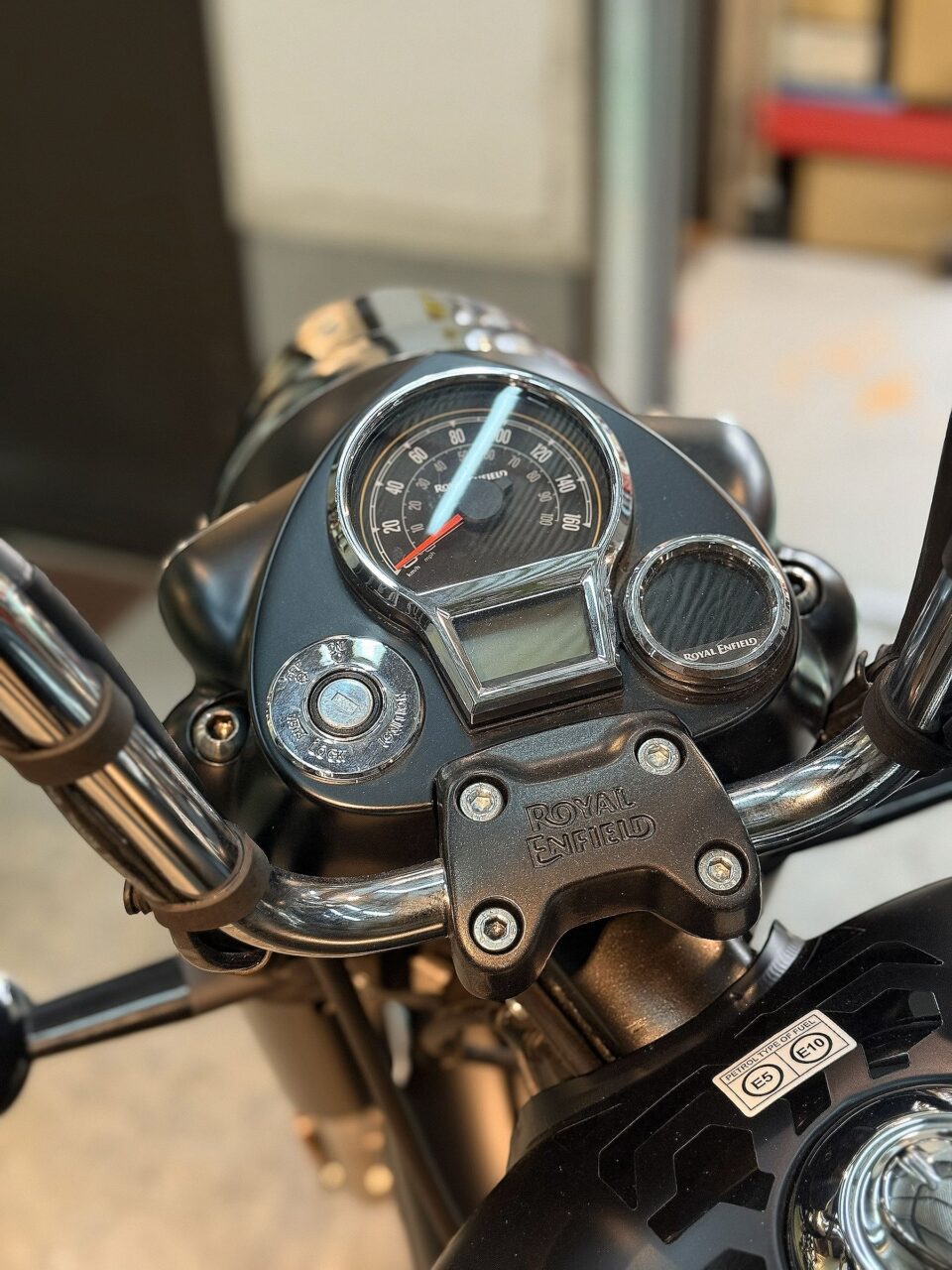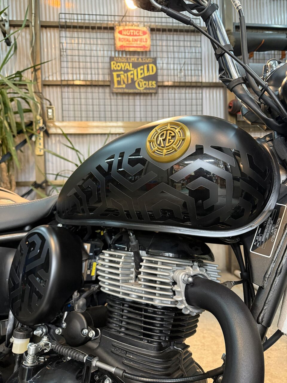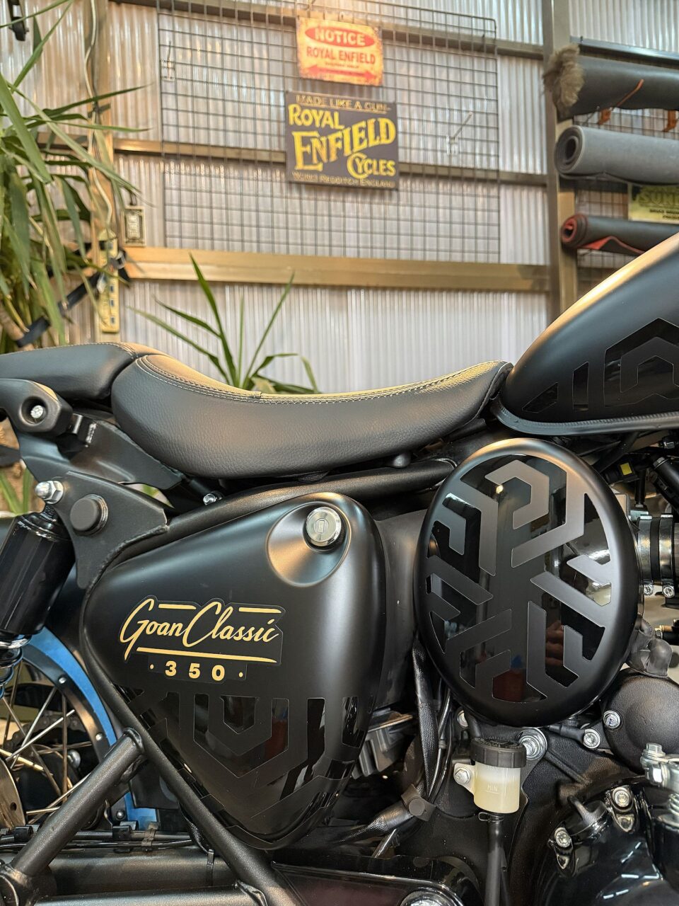 前から見ると、フロントフェンダーの先にROYAL ENFIELDのロゴかあると思えば、ステムアンダーブラケット所にもROYAL ENFIELDのロゴが。この手法はGOANだけ。とても特別感があってROYAL ENFIELD好きには堪らないそうです。^_^
