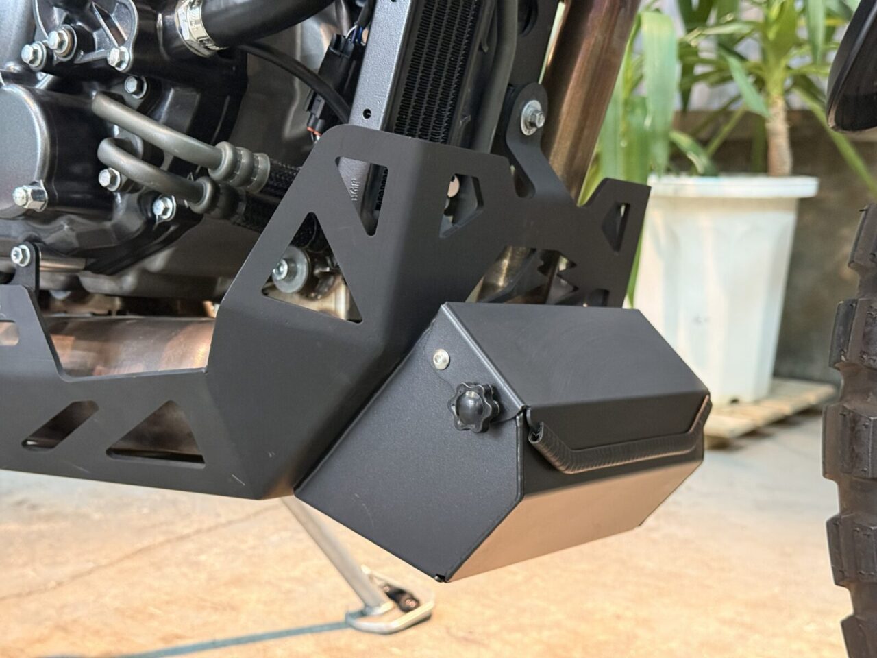 アンダーガードの前に付いたツールボックス、テールバックに、フェンダーアップスペーサーなども