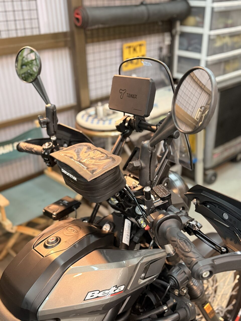 ハンドルバーにマウントされたバックなども、TANAXのスマートモニターのカバーを入れるバックだったりします。