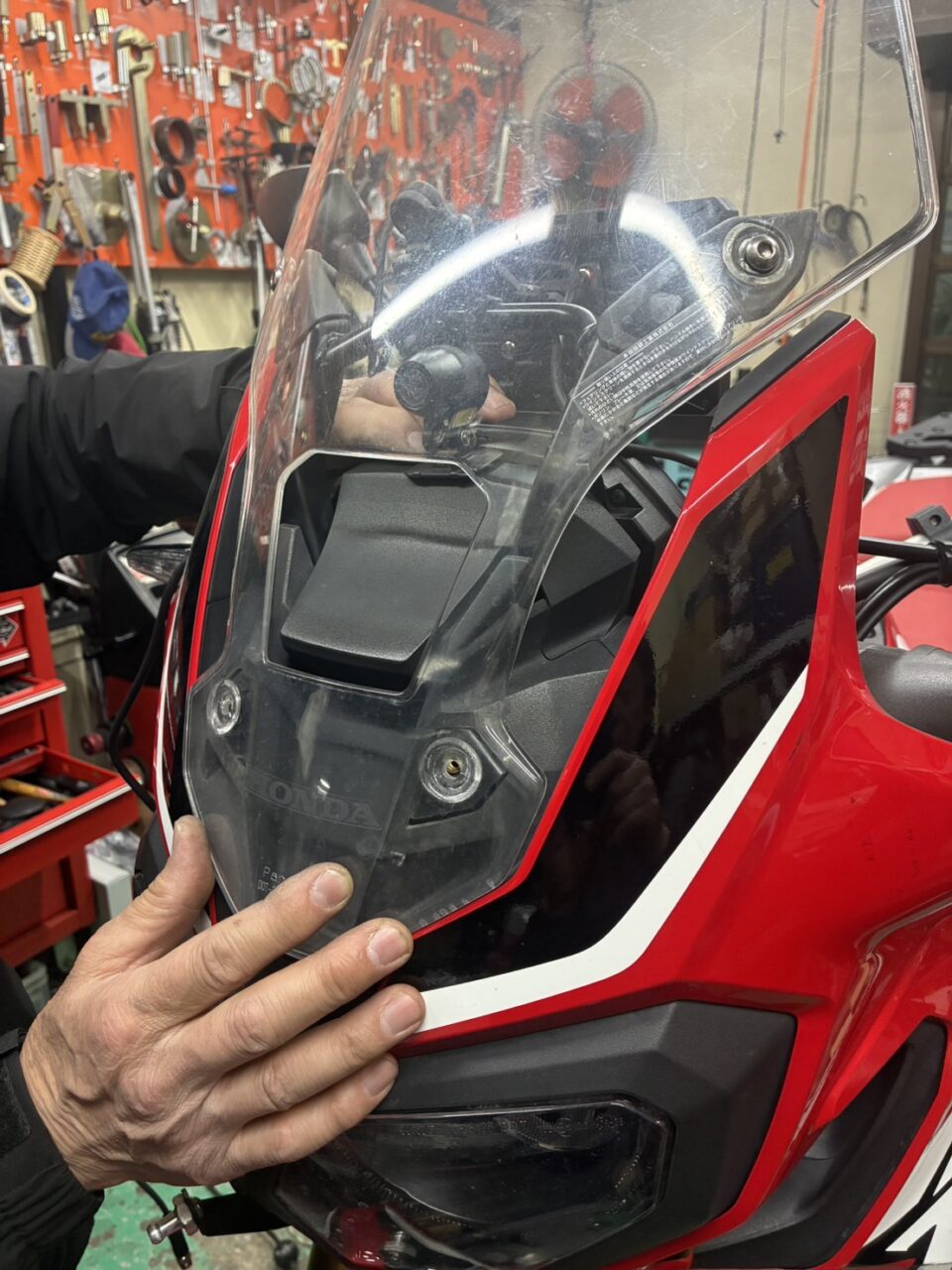 フロントカメラはなるべく鮮明に録画したいので、最後まで悩んだ位置。スクリーン越しに装着するパターンと、その下側に開口しているスクリーン無しの場所に装着するパターン。最数的には下記の位置にしたのですが、オフロードへあまり行かないという方なら、開口部が鮮明で良いでしょうね。AKAさんはもちろんバキバキのオフローダーなので、泥跳ねやストーンクラッシュ!そして砂埃などから守るために、スクリーン越しで装着。